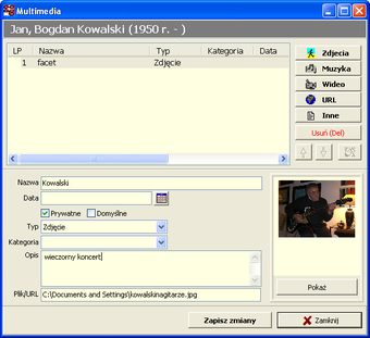 Program umożliwia dodawanie osób oraz edycję ich profilu. Oprócz podstawowych danych osobowych, takich jak data i miejsce urodzenia, można dodać zdjęcia, materiały wideo oraz pliki dźwiękowe. Do każdego profilu można wprowadzać szczegółowe dane dotyczące zainteresowań, zawodu, wykształcenia a nawet grupy krwi.